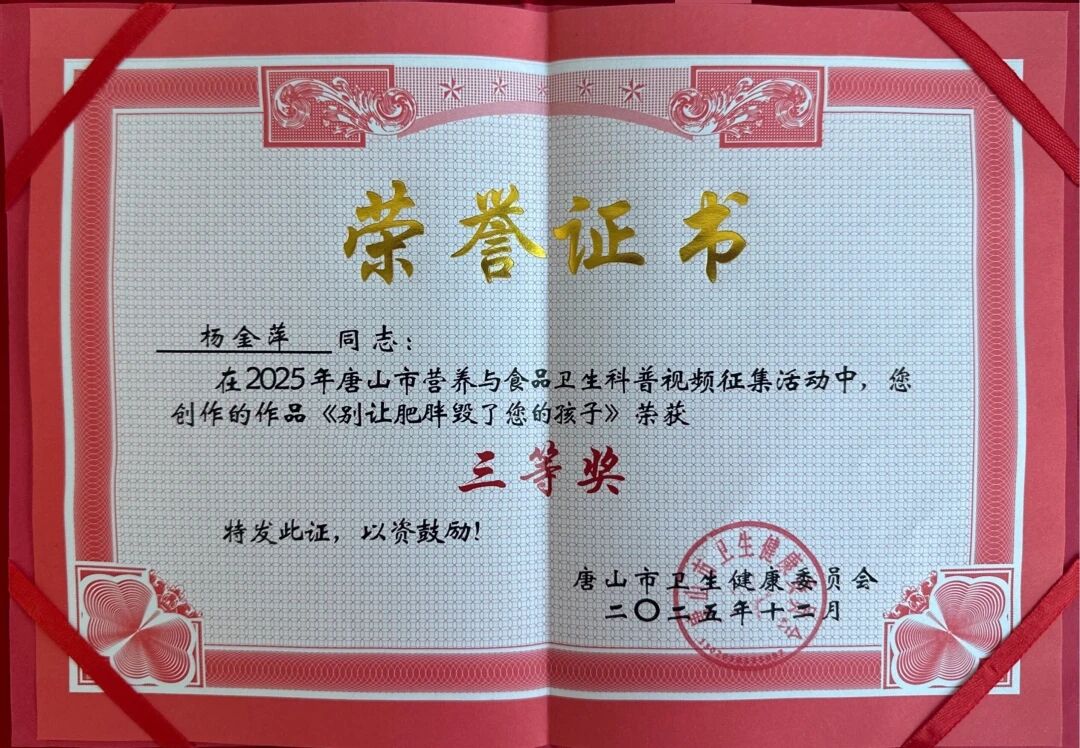 近日,2025年唐山市营养与食品卫生科普视频征集活动获奖名单正式公布。我院临床营养科主任杨金萍创作的三部科普作品《别让肥胖毁了您的孩子》《“肌”不可失老年人正确减重保肌肉》《一餐一饭的健康密码》凭借扎实的专业内核与新颖的呈现形式,分别荣获三等奖及优秀奖,用实力展示了我院在营养科普领域的专业水准。