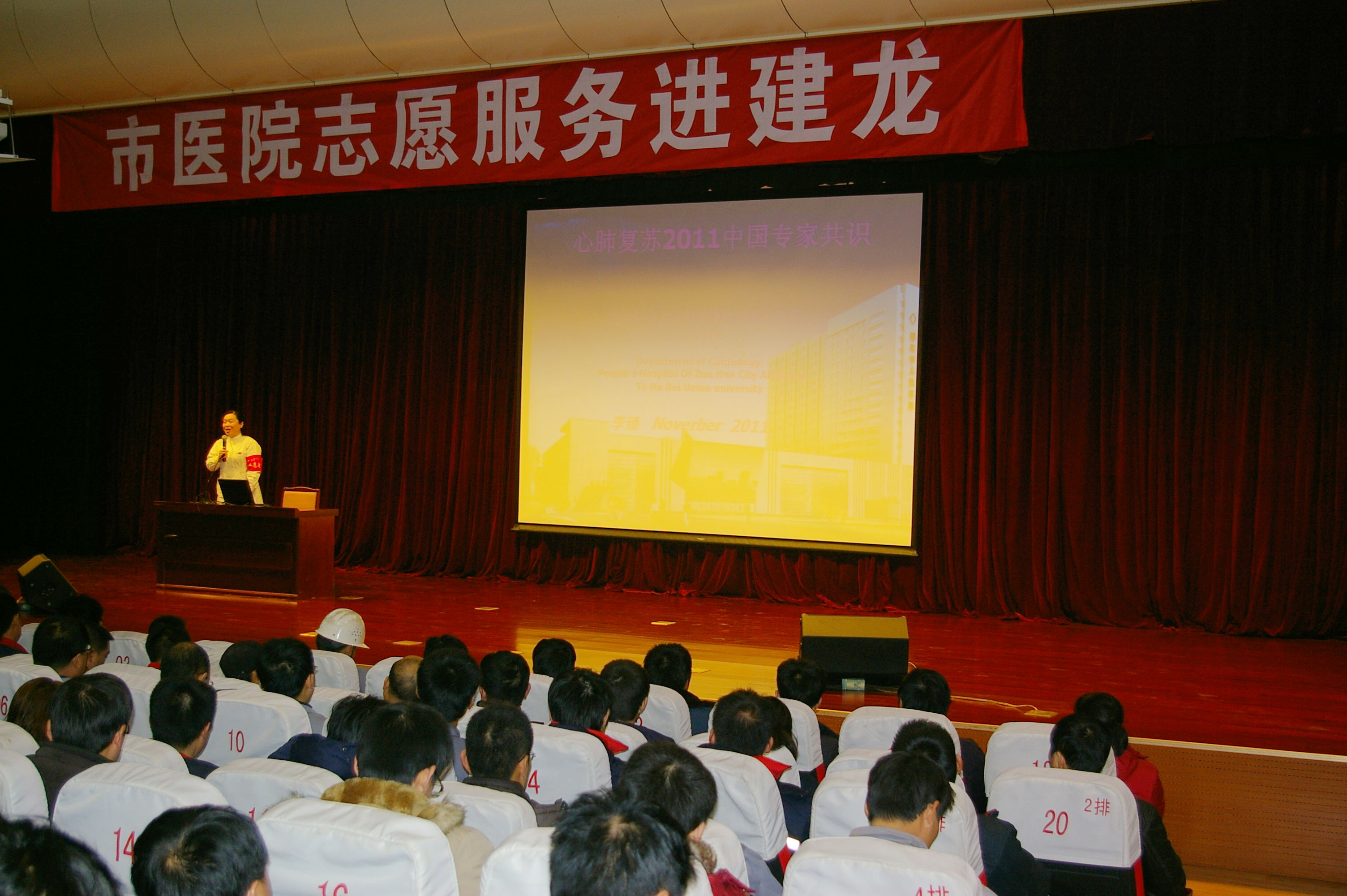 2011年12月5日是第二十六个国际志愿者日,为积极发扬“奉献、友爱、互助、进步”的志愿者精神,我院志愿者服务队在今天走进唐山建龙实业有限公司,为员工培训现场急救知识和技能,活动得到了建龙企业的大力支持和广泛欢迎,有400多名员工参加了现场培训。 我院的志愿者首先向员工们发放了宣传资料,心内科李臻主任讲解了呼吸心跳骤停的抢救程序,大家认真听课。随后,骨科侯金平护士长讲解了坠落伤的现场病情评估,正确的搬运方法以及包扎止血的技能;李小青护士长通过借助“模拟人”重点示范指导了徒手心肺复苏的操作方法,并邀请职工现场演练。员工们踊跃上台与医护人员进行互动,模拟急救现场,熟悉怎样正确搬运伤者,学习心脏按压的手法和口对口人工呼吸的姿势,真正掌握徒手心肺复苏的技能,收到了良好的效果。如果大家能够有效的现场自救,并同时进行“120”呼救,才能更好的挽救伤者的生命。